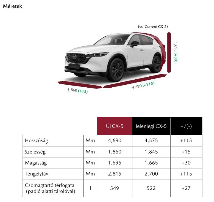 [4] A Prime-Line kizárólag elsőkerék-meghajtással érhető el. Vadonatúj Mazda CX-5 2.5 e-Skyactiv G (FWD): Előzetes adatok: üzemanyag-fogyasztás: 7,0 l/100 km; CO₂-kibocsátás: 157–159 g/km (WLTP kombinált); CO₂-besorolás: F.